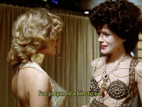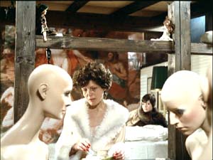The setting is entirely within one room. Time is marked by dramatic changes in clothing as well as hair and make up. It is a classic example of the “well-made play,” its five acts limning the requisite rising action, climax, and denouement. The emotionally ugly – and literally claustrophobic (we never leave this one apartment) – world of the film yields images of striking beauty, and resonance. The rich autumnal palette of the setting (orange, gold, brown, black, white and bursts of red) is contrasted with the bright, clashing colors of the costumes (such as Gaby’s cartoonish yellow suit and purple tie). Most notable is a gigantic blowup of Poussin’s 1629 painting “Midas and Bacchus” (wittily cropped on the right to stop at the goat’s posterior), which covers an entire wall. It reminds us, on one level, that Petra – like Midas, whose life was blasted by the “golden touch” bestowed on him by Bacchus – should be careful what she wishes for. The nude Bacchus stands in the center of the mural – and not infrequently Fassbinder’s compositions – with the body of, well, a Greek god, a larger-than-life male in a film peopled entirely with women. My assumption is, this overbearing backdrop represents the patriarchal system which underlies, and perhaps even dooms, the relationship of Petra and Karin. When Karin announces that she is leaving Petra, the key light shines not on her, but on Bacchus’s glowing genitalia which hover over her. And of course she leaves her for a man – or rather for all men.