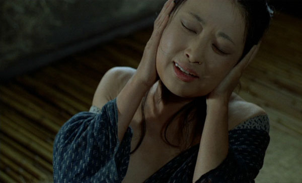 Visually, besides the elements and their impact on the lovers, skin tones are an important accent on the film. From the flushed faces of the lovers, to the pointed brown nipples of Seki to the painted white face of horror on her husbands ghost, the flesh is prominent and present. In a telling scene Toyoji shaves the pubic hair of Seki as she lays back and cries about the depth of their love and the hopelessness of their situation considering they will almost definitely get caught. Her covering is removed by her lover, she is left vulnerable and exposed, her lust available for her husband to see.