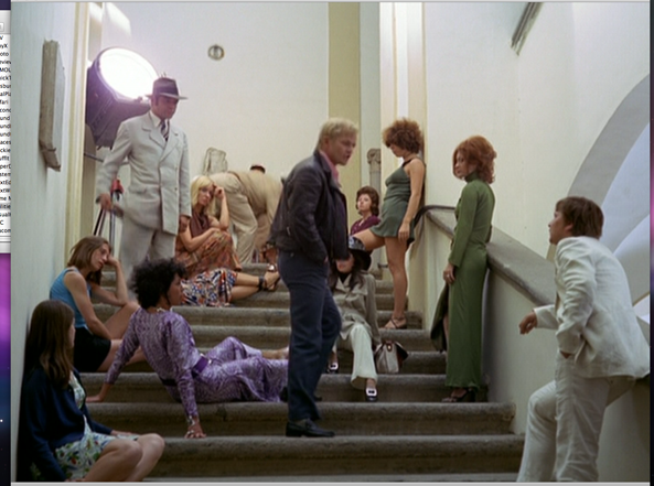 Scene after scene in this beautiful film, where the characters (actors waiting to be ‘directed’ or workers on the film waiting to be directed) are often placed as if pieces on a chess board. They will be moved around throughout the film, shown as pawns in a game, archetypes and symbols of some other thing. People in this film are objects. They are objects to us, to the director and to each other. Everyone ‘tantrums’ out their emotions, and no one (except the long-suffering Spanish Waiter) delivers any authenticity. Scene after scene Fassbinder ‘arranges’ everyone so we get a sense of the superficiality and the inauthenticity of existence. The feel is claustrophobic. One particular scene shows everyone laid over the top of each other on a balcony over the ocean. the water ripples beneath them, and the bodies writhe against each other, as the director looks over at them from above. We sit above the director, looking down in judgement upon them all. The scene is breathtaking. I watching it over and over again.