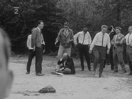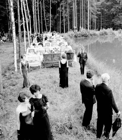 It should be added that The Party and The Guests  was written by Ester Krumbachová and Jan NÄmec and directed by NÄmec, Ester being his wife.  This film is very much a collaboration between the two, though Krumbachová usually only receives writing credits. Visually the film occurs as a kind of cinematic documentation of an al fresco theatrical event. It’s documentary ‘feel’ may be partially what lays behind it’s being taken as such a serious threat. There are essentially only three scenes and all of these are in the same (or a nearby) Forrest. In terms of camera work, The Party and the Guests is full of stillness, differing from previous Namec films. This stillness is offset by a striking audio track.