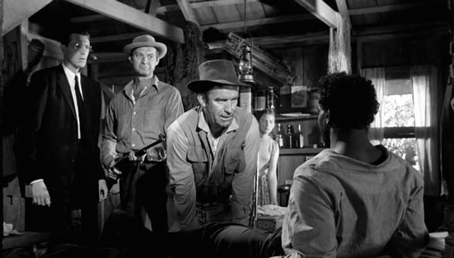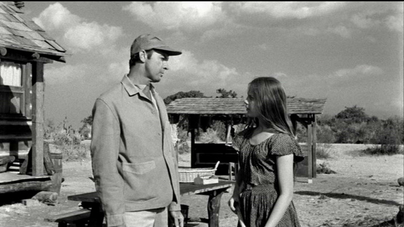 Inhabiting the island are redneck game warden Miller (Zachary Scott) and a young teen girl named Evalyn (Kate Meersman), whose grandfather has just died. Evalyn can’t be more than twelve years old, and this is made obvious by her just-starting-to-develop child body. (In Buñuel’s signature style, we see the dead grandfathers bare feet sticking out over his death cot.) When Miller heads to town for the day, Traver befriends the trusting girl and gives her $20 for food, supplies, and a shotgun. Traver has a moment of temptation when the child’s towel slips a little. Tempted by the innocent girl’s provocative lack of modesty, Traver cautions her to wear more than a towel after showering and deliberately refrains from touching her. Not so with Miller, who later works much harder to convince Evalyn never to let on what he does with her privately inside the cabin. When Miller discovers the twenty-dollar bill, he assumes the worst about the island visitor; after all, he knows exactly what he’d want from Evalyn.