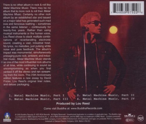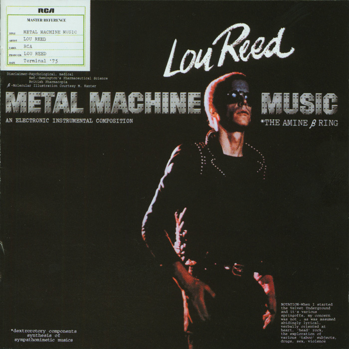 As a radical departure from the rest of Reed’s catalog, Metal Machine Music is generally considered to be either a joke, a grudging fulfillment of a contractual obligation, or an early example of noise music. The album features no songs or even recognizably structured compositions, eschewing melody and rhythm for an hour of over-modulated feedback and guitar effects, intricately mixed at varying speeds by Reed himself. In the album’s liner notes he claimed to have invented heavy metal music and asserted that Metal Machine Music was the ultimate conclusion of that genre. The album made Reed a laughing stock in the rock industry while simultaneously opening the door for his later, more experimental material. Historically, Metal Machine Music is now considered a seminal forerunner of industrial music, noise rock, and contemporary sound art.
