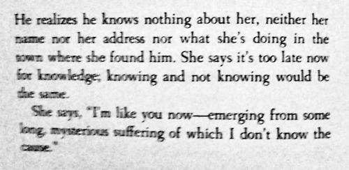 He thinks he can see in her smile the tug of tears, of absence, and in her eyes and new hypocrisy, the kind that comes a couple of weeks after the beginning of something. It frightens him.