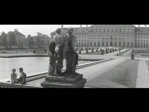 So with this statue is the man holding the woman back to protect her from danger? This is X’s position. Or is the woman urging him forward encouraging him into something breathtaking? This is A’s position. Needless to say neither X or A can agree and after their lengthy exchange on the subject of the statue Resnais abruptly shifts the locale so they are no longer regarding the statue itself but rather its representation in the map of the grounds; which incidentally equally mirrors the removed position held by the Marienbad spectators with regard to the text central undecidable while the same conversation or a variation of it ensues.