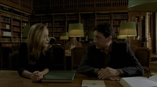 Although the acting and recombinant twists of the plot dance with spontaneity, Rivette’s mise-en-scène is precision exemplified. Every move is choreographed and framed with surgical accuracy. And the subsequent phenomenology of space astonishes. The stage is at the hub of all activity, a tabula rasa/void connected to all the streets, rooms, and even rooftops of Paris. Architecture comes alive at every turn. Doorways become portals to desire; rooms, especially those lined with books, become arenas; and staircases.· Rivette has a thing for staircases. (Discussing his film Secret défense with Frédéric Bonnaud, Rivette spoke of staircases as characters: “I chose the house where we filmed because of the staircase. I think it’s where all the dramatic loose ends come together, and also where they must resolve themselves.”) The opportunity to ascend or descend a stairway somehow frees Rivette characters to perform anything from spasms of absurd body-language to inspired bursts of soliloquy. Early in Va savoir, on the stairs backstage at the theater, Camille quips to herself, “It’s more whim than drama.” And whim is closer to the heart of the matter than any artifice.