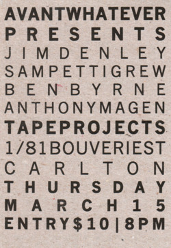 As for the place this disc takes in the evolving conversation around sound art, perhaps a hint can be taken from the Amanda Stewart poem itself. One of her words in the poem Absence is “symbioticpresymbol” which seems perfectly placed in the Jim Denley recording of himself and 100 snails. This is not the sound of a man playing his instrument in the wilds of the field surrounded by 100 snails. The symbiosis, the connection here is through sound and sound as symbol – presymbol even of a certain kind of artistic unity in all living things. Each sound works within an internal system of all-embracing limpidity but at the same time nurture a discrepancy that cannot be assimilated. This outbreak of sound that comes from asymmetrical sources is both a redemption and a threat. This combination holds the promise of symmetry while we understand this stability to be a thing retrospectively imposed upon each work. The unification here is tenuous. In short, it can only possibly exist in the sound, but it exists solidly and completely within the sound.