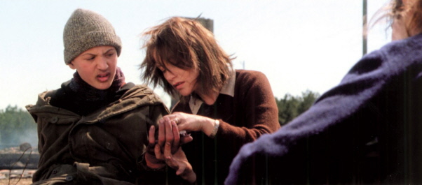 Anne and the children start to wander, always in the dark. Haneke uses no tricks here – he really did his filming in the dark with only lighters and lit brushwood to light the “world” as the script dictates. It makes for a terribly bleak vision and, typical of Haneke, increases a sense of anxiety and distress in the viewer. I started to watch this film in the afternoon, but had to turn it off and go back in the evening because I couldn’t see anything with the light of day behind it. At this point the film is shot through Anne’s point of view, and we have a sense always, of impending doom.