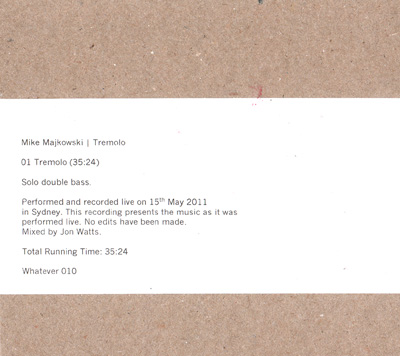 There are three reasons I want to just sit very still and listen. They are Chris Abrahams, James Waples and Mike Majkowski. All three of these musicians are incredible live, but to treat myself to a warm up I have been listening to Frost Frost as well as a beautiful little disc I have by Mike Majkowski called Tremolo released on the Avant Whatever label. It wasn’t till last week when I was tidying up the blog that I realized I hadn’t reviewed Majkowsji’s incredible disc. Odd, seeing as its one of my favorite Double bass discs. So this is the post that rectify s that situation.