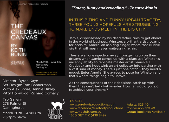 So it is timely that Sure Foot Productions raise the funds and give us a performance of the Credeaux Canvas, written by Keith Bunin before he was adapting Joe Hill. This performance is currently on at the Tap Gallery here in Sydney from 20th March 2013 to 6th April 2013.