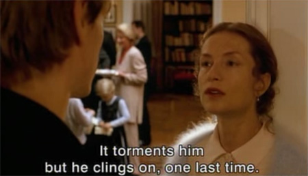 Like The White Ribbon, Haneke draws parallels between relationships in order to explain certain kinds of behavior. On the surface Erika’s pathologies seem to defy explanation, and yet when examined through the relationship with her domineering mother, we begin to wonder that Erika (Isabelle Huppert) is as sane as she is. Sex and the erotic is something that has always been denied her, the implication being that she is a professional musician of the highest order and therefore above the basic desires of the body. In the novel, Erika is described as her mothers possession. Her mother sees the control and domination of her daughter as a gift to her daughter, and something for which her child is in her debt. Erika was destined to become a great pianist. It was her mothers will. Erika is not only to be dominated but she must also be grateful for this domination.