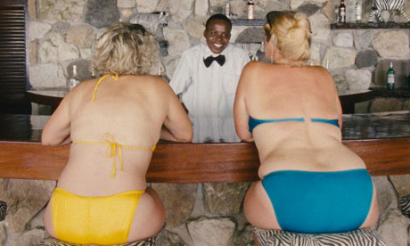 This is something Ulrich Sedl feels very close to. He films what he considers to be real life observations. He want’s his protagonists to look like real people because this information is so difficult to understand, so antithetical to all we wish for, he removes any barrier between the viewer and his point. For a great part of the film, the incredible Margarethe Tiesel is naked or close to naked. We literally see her unmasked. Her body is large and old and drives hard against the viewers stereotypes of desire, and yet she is desire personified. She is a sugar mama; an older woman who has traveled to a German friendly resort on the beaches of Kenya specifically to have sex with very attractive, very young Kenyan males.