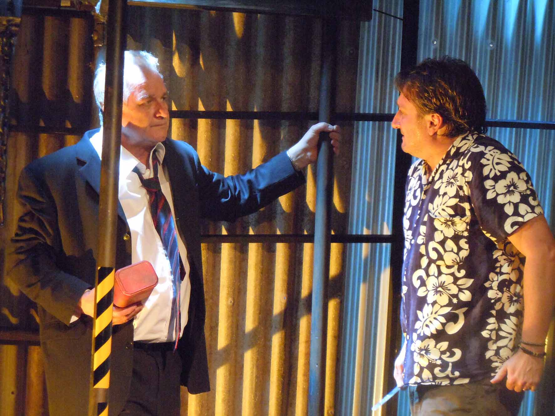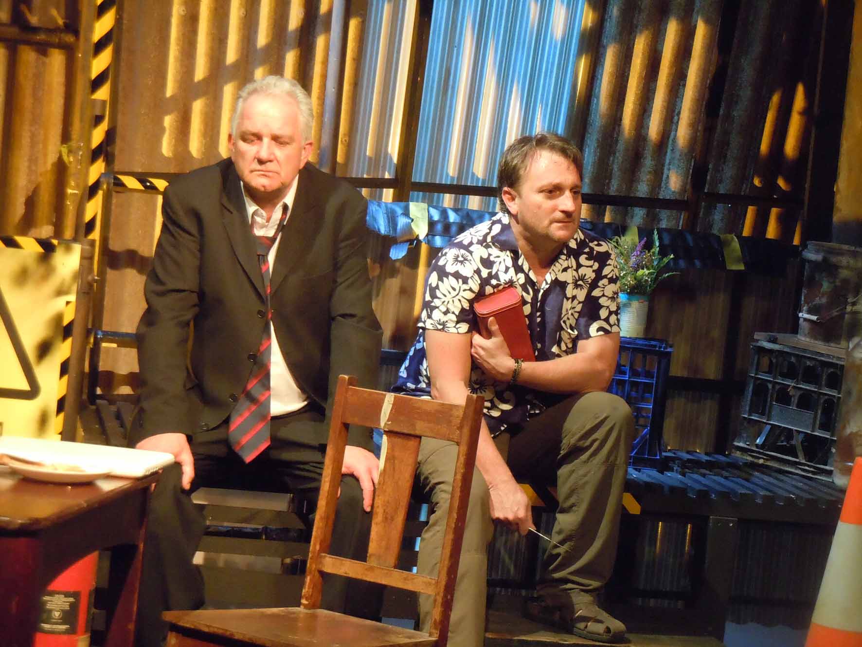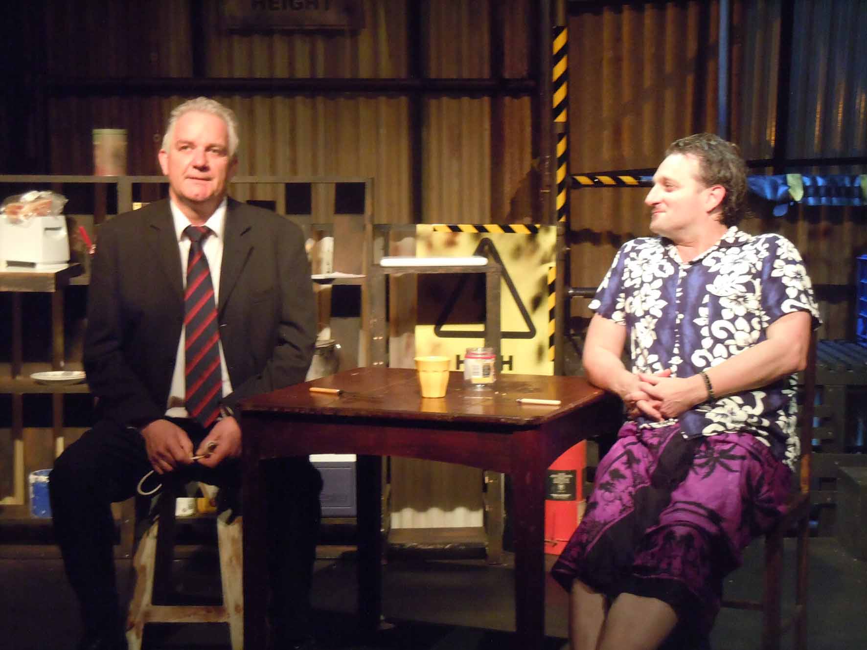 The Maintenance Room is the devastating tale of the precise moment two men facing this abyss collide. Allan Walpole, as director and set designer, has boxed these two characters into a small but detailed vision of The Maintenance Room as an object, demanding the characters spin their way through the universe in a perversely small and cluttered space. The Maintenance Room itself is a different place for the two men; it is a home and freedom for Vincent while it is filthy and the gateway to hell for Edward. Christine Greenough and Allan Walpole shuffle the characters around so that we are given the emotional contact with a large amount of space even as the maintenance room is so claustrophobic.