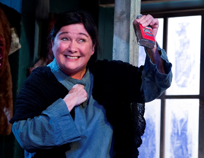But nothing is lost in New Theatres adaptation of this great and ultimately important farce. Talmacs has gathered a talented, devoted cast, the linchpin of which is the gorgeously silly Semyon. Walraven’s Semyon is never quite able to convince himself of this supposed nobility so that we are presented with a man on deaths door who is so full of cheeky life that we can’t imagine how death could possibly claim him. Jodine Muir is a clever Masha, playing Semyon’s wife in such a way that she never comes across as a victim of her exasperated dealings with her ridiculous husband, but rather a woman living fully in the moment no matter what it brings her. It gives Masha a place all of her own rather than a position as the straight (wo)man to Semyon’s cute charm. Living with the married couple is Masha’s mother, Serafima Ilyinichna wonderfully played by Jeannie Gee who delivers some of the best lines in the play with her eyebrow-arched wit. She is repeatedly taunted as the bane of everyone’s life, when she is really the most mischievous and fun character in the play. Gee makes great use of her wonderful role, underplaying it to perfection so that her wonderful lines sneak up and round out the texture of the overt hilarity of the larger characters. The rest of the large company are all strong, well cast and having so much fun with their over-the-top stereotype mock-ups that it is impossible not to be drawn into the pleasure of the entire expereince.