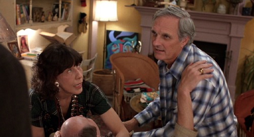 The film then launches into the rapid paced, perfectly timed screwball comedy of odd-ball characterisation that Russell has become famous for. Nancy will discover that Tina was in the house when she tried to have sex with her ‘control freak’ husband, and this moment begins a jostle between the mistress and the wife that favours the wife at every turn. However, what we soon discover in Flirting with Disaster is that all the relationships have their invisible great Other as Lacan would call it, the dictatorial ideal that controls decision and the sublimated other that controls desire. This is a question that fascinates Russell, and one of the reasons his mothers (even when they are gay males) are so sexually potent in Flirting with Disaster. Russell’s perspective is not born of sympathies, nor is it in response to an established trope (an interesting point given how much he likes to upturn cliché) rather it is because he is always interested in the invisible that controls us, and in Flirting with Disaster, there is no greater invisible control than the parents over our lives, exemplified in the image of the (M)other. Mothers are odd but enormous in this film, from the hyper slapstick nervousness of Pearl (a brilliant Mary Tyler Moore) through the perfunctory claiming of responsibility, then equally abrupt dropping of it from Valerie (Celia Weston) to the maternal nurturing of a man going through an intense acid experience of Mary (lily Tomlin) and all are strongly equated with a throbbing sexuality that seems to vibrate around them constantly.