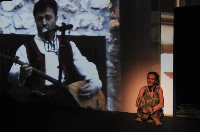 Seven Kilometers North-East opens with the audience facing a large white wall, a doorway carved out of it like a blackened tooth, split into two screens upon which a moving image of a plane preparing to take off sits on repeat. We know we’re about to take a journey. Above the white wall washing is hung on lines, and as the play progresses we will see them absorb images of the filmed journey Kym took through her various visits to Bosnia. Soon Ms Vercoe appears and begins her spirited tale of modern Bosnia, the huge images of her film making projected behind her. She makes coffee, drinks beer and smokes and talks of similarities, differences, beauty and joy of Bosnia, while the lilting tones of Sladjana Hodzic are performed live at various intervals. All of this hinges on a book she read that first led her to Bosnia, The Bridge Over the Drina written by Nobel prize winner Ivo Andric. For Vercoe, an Australian, the horrors of the Balkan wars in the early 90’s were newspaper clippings, and history lessons – informative anecdotes, newsworthy items to be thought about, considered and allocated to the infamous atrocities human’s can inflict upon each other during war-time. History lessons separate from the present of an Australian school girl.