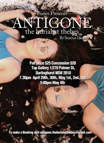 At the time of this writing, the opportunity to see Antigone: The Burial at Thebes by Seamus Heaney produced by Furies Theatre Company has passed. Unfortunately a tight season for the play and an enormous imposition of real life for me coincided but I wanted to continue my review, because this is a stunning debut by a small theatre company who appear to have a lot of talent and wit in their ranks and perhaps you will get a chance to see them perform this piece in the future.