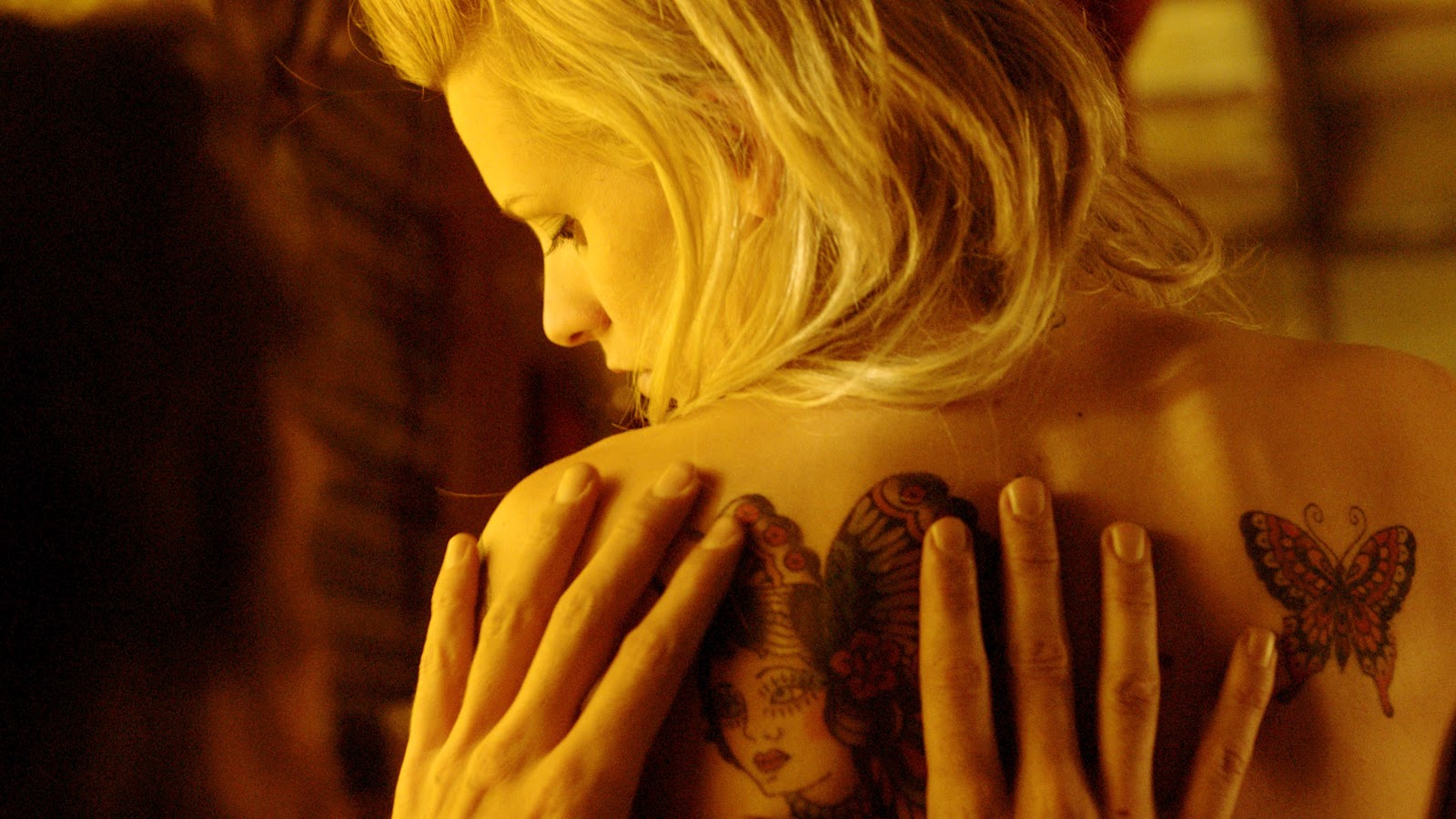 Along side of the clever script and excellent editing is an acting combination that sizzles. Veerle Baetens is Elise and Johan Heldenbergh is Didier, two actors with intense chemistry between them. These actors make us care deeply for their characters and never is there a moment when you can’t feel the love. Baetens particularly is gorgeous as the tattoo artist free spirit, her beauty so deftly contained in an indefinable fire within her. Scenes of her in an American Flag bikini lolling about seducing Didier on the hood of his truck, her body a mass of beautifully colored tattoos is one of the sexiest,and most exquisitely beautiful scenes of female sex appeal you will encounter. Even steeped in tragedy, the fire inside her glows so that we look upon her in wonder just as Didier does. Heldenbergh is a perfect match for her enormity, his physical size dwarfing her, his woolly hair hiding his face, his passion for music smouldering within him even when he doesn’t play. It is partly due to the believability of their love, that their conflicting ideologies seem so tragic.