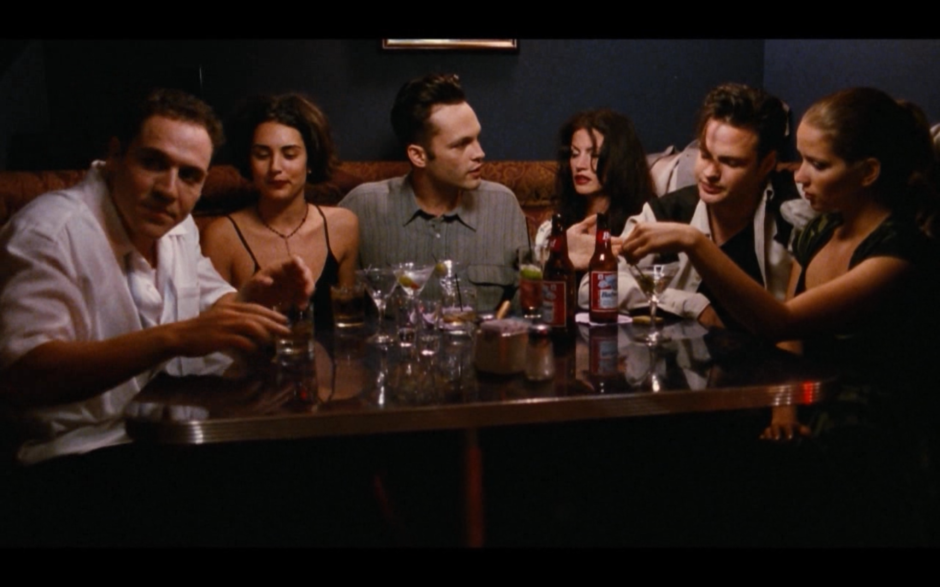 To further enhance this dynamic, Liman cleverly has the group of men play out scenes from earlier films that exhibit heightened machismo – particularly Goodfellas and Reservoir Dogs. In one very funny scene, a riff-off the titular circular table scene lifted from Reservoir Dogs, as the young wannabee actors discussing the steadicam shot from Goodfellas, the walk through the kitchen. Rob (Ron Livingstone) makes a comment that the shot must have cost them a fortune, so later in the film, when Liman has them recreate the steadicam shot through the kitchen of a club they want to attend, he does it with a handheld, but still does a stellar effort repeating Scorsese’s cleverness. After the round table discussion, the group walk in slow-mo to their cars, in Reservoir Dogs configuration and segue into some very funny almost synchronised driving, all done to great contemporary swing by Average White Band. The positing of Scorsese’s machismo against these effete actors, Liman further enhances the trembling anxiety each of the young men so obviously exhibits. These witty scenes represent an ever present confidence in quality Liman has despite this being his first film.