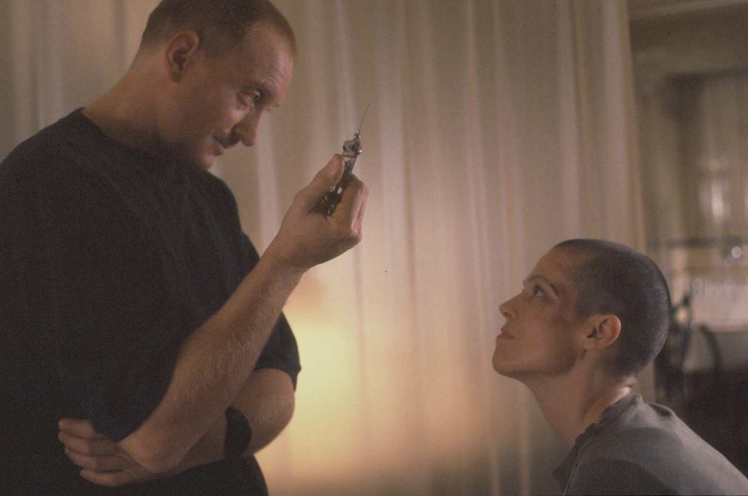 The most obvious entry into the “this is a Fincher film whether he likes it or not” category is the lighting and setting, something we will see immaculately displayed in his next film Se7en, when Fincher feels he has more creative control. The opening credits, which present an immediate travesty to the Aliens story, that one of the facesuckers could have survived and stowed away on board the Sulaco notwithstanding, in many ways present a homage to the minimalist power of the first, one can imagine the first time director, taking his now-famous multiple shots despite the depression economic recession (which probably had a lot to do with why he was hired ) foreseeing the emerging importance of editing, which is something Fincher films are famous for. But one of the crucial points of trivia that make Alien³ somethign of a wonder, is that it is all plastered over the top of an abandoned (due to a legal freezing) 007 set that never threatens to impose itself on Fincher’s style. That a first time director (even if he has been endorsed by Madonna) can stick an outer-space thriller over the top of a Buckinghamshire James Bond set and have it leave no trace is remarkable enough to warrant my second sentence emphasis and I defy anyone who didn’t know that before watching to have worked something like that out of their own accord. The only tell-tale sign is that the set makes absolutely no sense at all in terms of the plot – why does this maximum security prison have a lead compression chamber, why does it have a myriad of insane corridors and weird hatches etc etc. Fincher has a talent for creating evocative worlds over the top of existing sterotypes, think of the graffiti neon in the stately mansion in The Game or the bleak gut wrenching rain soak over the hope of domesticity in his next film Se7en, and if he’d been allowed to do more of his own thing, and not adhere to the overwhelming distress of producers making the absolute last film they could afford, we might have all been weirdly confronted by some sort of Bond-esque feel to the film that ironically permeates. But then, if economic situation was different, they wouldn’t have had to use the abandoned Bond set, so that negates the point even as it underscores just how much Fincher was able to do with so little.