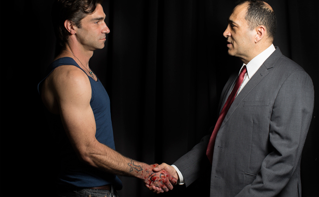 Fennessy couches all this into a three act play that, cleverly uses the same two actors to portray different characters in a story of corruption that starts in the foul-mouthed halls of government and ends in the genteel speak of murderous criminals; each of the three acts representing a different tier of the same corruption scandal and each a battle between males for power over that scandal. Using the same two actors hints at the notion we are watching the same man over and over again, individuals made homogeneous by their motives. Ashley Lyons and Nicholas Papademetriou are convincing and smooth in their transitions, but as the play’s momentum builds, we start to see this is the same problem causing the same problem over and over again. It’s a subtle and nimble way to depict a complex issue that sounds preachy or (the dreaded) PC if you try to articulate it, and particularly carries weight coming out of the mouths of men.