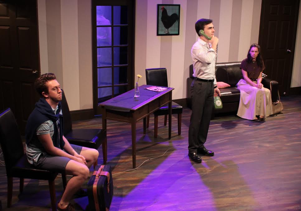 To support the direction, Martin Kinnane designed a rich, 1980’s style theatrical set, that still evokes a contemporary feel. Walraven directs dance-like set changes that work well with Kinnane’s lighting bringing the off-stage on-stage in a delightful manner that is consistent with Durang’s playful script. The cast are dressed similarly, with the 80’s in mind, but underplayed so as to easily move back and forth in time. At the pulsing heart of the show are Bruce (David Hooley) and Prudence (Rebecca Scott) as the pairing who shouldn’t be. Hooley’s Bruce is a cheerfully confused man, feeling all the more confident because of his contracting embarrassment at his own awkwardness. Scott’s Prudence is a great response to his confusion, her rising hysteria one of the funniest aspects of the show as we sympathise more and more with her desperation for something “normal” in the face of so much absurdity.