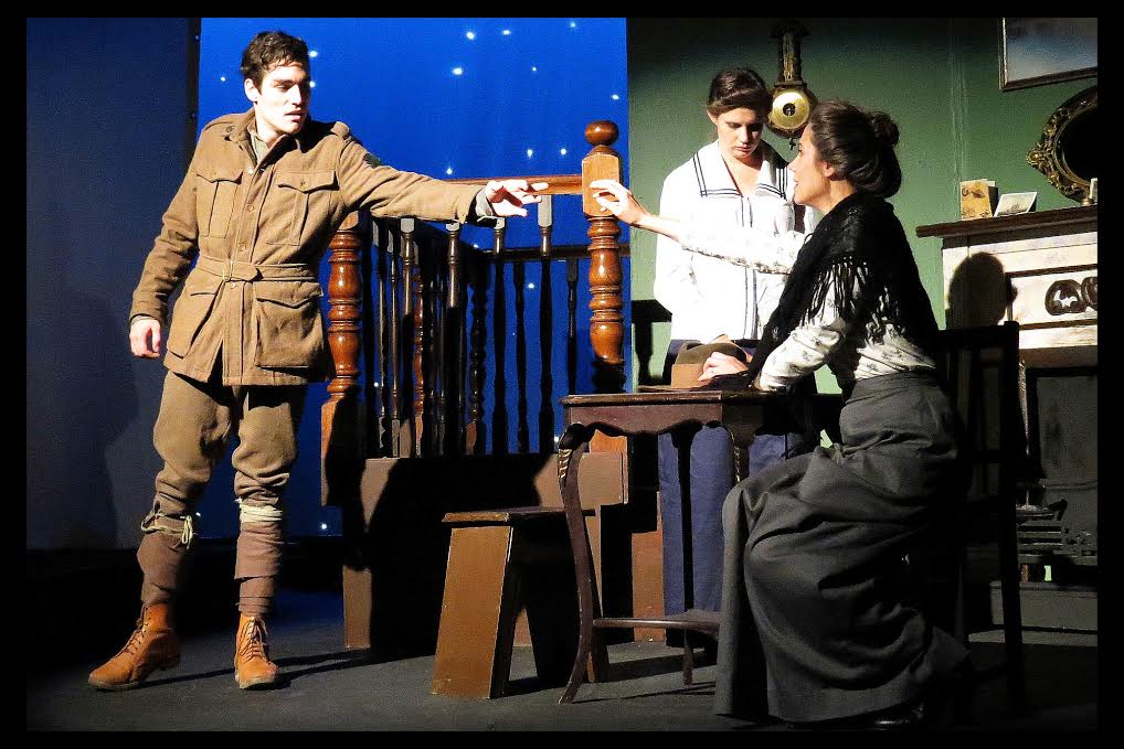 The women in Simpson’s life, his mother Sarah portrayed by Julia Kennedy Scott and his sister Annie performed by Penelope Berkemeier become, under Mark Nagles direction, the key forces for our connection with the humanity of Simpson. We first meet him as a naughty school boy, being scolded by his mother, but we remain with the family for a good portion of the show, getting into the nuances and the delicate underpinnings beneath the bustle of daily life that love and careful care provide. This emphasis on the Simpson Kirkpatrick family give us access to the heart of John Simpson and enhance a character development that makes the final events of the Simpson story all the more tragic. Both Kennedy Scott and Berkemeier are strong in their large roles, occupying one half of a uniquely split stage that brings events happening on the other side of the world into the heart of the written letters that might be connecting them. The staging beautifully enhances the plays interesting structure so that each side can represent a concurrent event, a memory or even a wish for something in the future. For the most part, this works, and carries the emphasis of familial ties that the two women embody in the show.