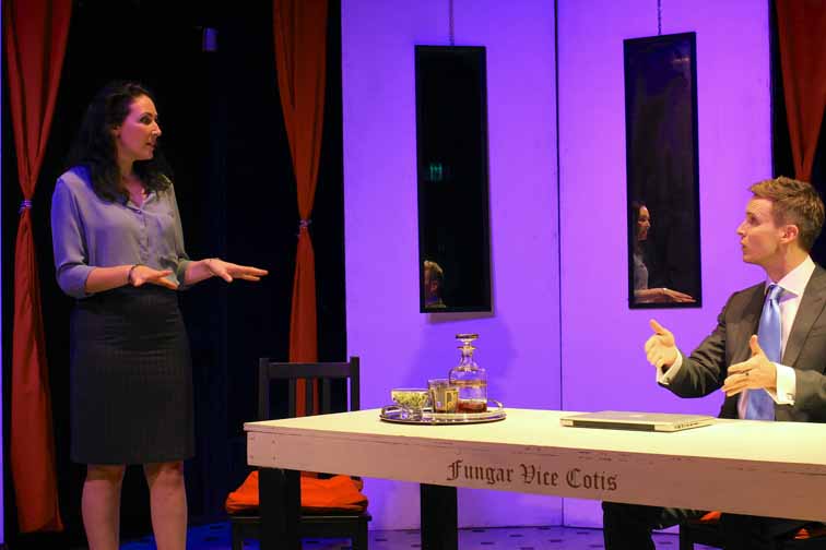 This particular production at the King Street Theatre is an excellent chance to catch this challenging and interesting contemporary Australian play. Directed by the talented Elaine Hudson and produced by Emu Productions, the cast are all strong, no doubt ironing out the minor first night jitters we witnessed at the start of the productions run. A stand out is Jess Loudon as Olivia Fox, who navigates a very difficult role with gravitas and a strong stage presence. Benjamin McCann as the young Jasper Cunningham equally makes the most of a complicated role, Morrow writing him a rather physically demanding performance that he takes in his stride. Vice is a mix of the highly verbose complimented by the sparsely physical, emphasising Morrow’s point about words and ambiguities, but when it gets physical, those movements are highly stylised. Hudson directs her cast well, incorporating seamless scene changes and a strong engagement with a busy set designed by EMU arts.