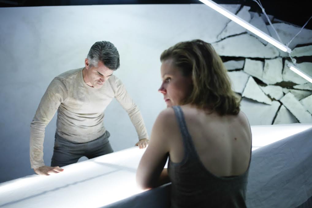 Ben Brockman positions a series of fluorescent lights above the sparse set as if they were a guide of sorts along a dark highway leading to a creepy psychic darkness. The lights are their own animal, both man-made and seeming independent, keeping the light low on a face, then exploding into an argent, humming blue pallor that acts remarkably as both illumination on that which we see, and a further layer of protection over that which we hide. Under Dalton’s direction, every aspect of the narrative is its own vehicle for exposure of the hidden, so Brockman’s lights, surrounded by Robinson’s words, serve to question the relationships between confidence /belief and consistency/logic. Equally thrilling is Dylan Tonkin’s set that, despite its jarring angles that crash together, acts in a parabolic way, at once cornering and capturing the actors while equally reflecting the authenticity of the lights and sound as if to expand into a broader world than its smashed corner implies. However, true to Dalton’s aesthetic Tonkin provides no relief in his expanse, rather a magnification of the universe that seethes within each of us, as if we are all nothing but a conflux of points passing through focus.