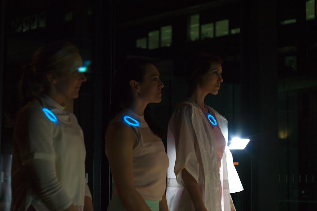 The senses and feelings of displacement are brought about by the movement of the cast, who embody complicity and work hard in their efforts to control their mind on behalf of A.N.N.A, the perfect AI intelligence that controls Zeroville. Of all the movements choreographed by Rachel Weiner, perhaps the most chilling is the absence of the brief flicker of a question that never flashes over the residents faces. This is highlighted through the engagement between Godard, a truly fantastic Amy Scott-Smith, and #2, the beautifully imposing figure of Danielle Baynes. The last words of Alphaville, “je vois amie” (I love you all) is the subject of the connection between Godard and #2 as they reach beyond flawless function to find a place to feel a connection with all the residents of Zeroville, a collection of anxiety free automatons whose defense is emotional impenetrability.