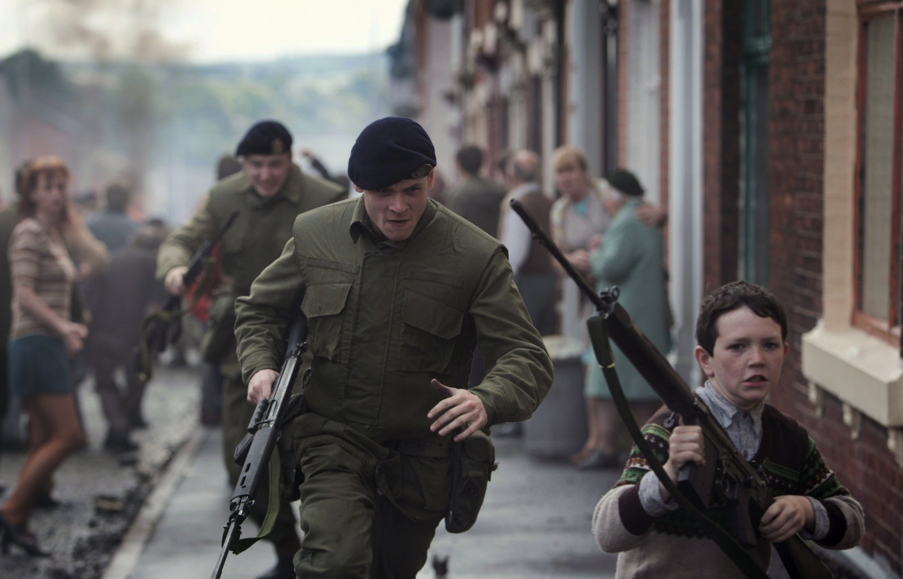 This combination of the safe place we call home and the war zone feels uncomfortably familiar, as if we are always expecting the smouldering unease of the suburbs to erupt into violence. Freud’s fear of the neighbour surfaces when the enemy is not immediately recognisable or can change allegiance in a moment and so director Yann Demange’s reflexive inquiry into the self feels both true and inevitable. As it becomes harder for Gary to recognise friend from foe, he correspondingly trusts himself above all higher authority, and his anger at the end is properly realised in a renewed devotion to raise his young brother himself. This gives ’71 a gret deal of observational power and separates it from just another war movie, biopic or morality tale. Demange has successfully tapped into what it is about The Troubles that so resonates – the Anglo version of a war brought right to the doorstep of one’s home. He achieves this through the constant gaze of the child, always affected and yet always engaged with their environment because it’s one to which they have swiftly become acclimatised. He also achieves it by the blurring of the suburbs of Belfast with the familiar site of the war zone, scenery that shocks us but seems familiar, until takes the action into an enormous apartment block, slows it all down and meticulously engages us with the truth of war and family life becoming co-mingled.