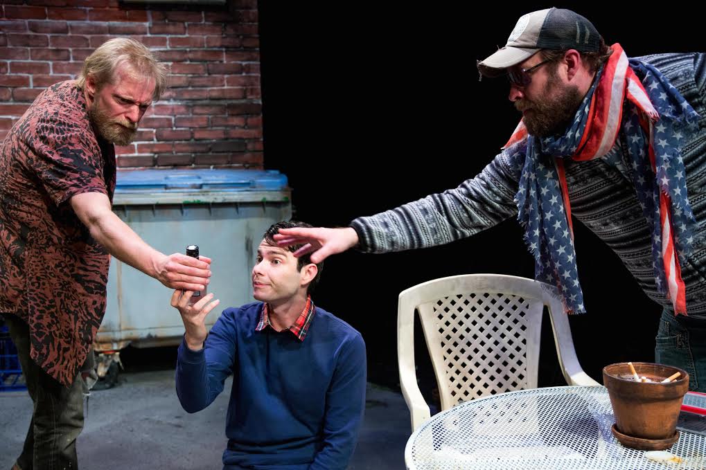 For The Aliens, she deals with the notion of genius, or more specifically the backyard genius we all either know or fancy ourselves to be – most likely a little of both is Bakers unspoken contention. Her vehicle for the conversation is Charles Bukowski, the ultimate tortured back yard genius, a man who worked hard to live up to his own mythology and spent a life time obsessed with an elusive authenticity. Her three characters are only ever seen in the mouldy back yard of a cafe in Vermont under the shade of a large smelly garbage bin that acts as both emblem of embracing of an impoverished lifestyle and the means by which the trio launch themselves in and out of the yard – or on and off the stage. As Evan (James Bell) draws closer to the world of beautiful soul suffering inhabited by KJ (Ben Wood) and Jasper (Jeremy Waters) he uses the garbage bin himself to enter the small yard, rather than entering and exiting via the cafe where he works and grows a respectable life. Within each of these carefully crafted characters and the dominating monster of Bukaowski (and through him Baker) the audience gains a sense of a real hidden within each character pretending to be a fake that is pretending to be real. Evan is attracted to a certain idea of truth as a destructive force that burns within KJ and Jasper, who work hard at living each day as slackers reflecting the real which remains hidden except through the appropriation of copies of what it actually is. Bukowski then, is a ticket to this real, and it is only in KJ and Jaspers failed attempts to emulate him that they are able to succeed in a certain authenticity. The catch is, only their witness can see it. They never get to feel that realness for themselves, hence their suffering.