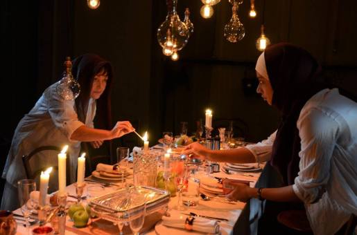 If we cease to think of the past as a river which, deriving from infinite streams, flowing pure into a thirsty, empty present, we begin to grasp some of what the writers of The Laden Table are trying to have us see. Rather, the present occurs in this production, as a small deposit or island in the middle of the stream of the past, constantly eroding and changing shape with the flow, but with very few rivulets to choose from in its future. Indeed, many branches of this memory river, turn out to be blocked by sand. The present, for the Ka’adans (Muslims) and Fishmans (Jews) sitting around their spiritual meals at Eid and Yom Kippur, cannot be reduced to a moment of collected memories. Rather it is a heavy moment, containing a great deal of latent or lost matter waiting for future selection and retrieval. Laden content can grow back from the tiniest of seeds, previously overlooked. The instant of The Laden Table offers a perception of new life, caught between the recent past and the present, a gap through which we seek a kinship. Thus, it happens that broken threads are brought together far too quickly, but it is the deepest injuries that should not be repaired in a hurry. This rapid repair job is the task of the elders, in this case Abraham (Geoff Sirmai) and Zainab (Gigi Sawires) who seem to embody the problems in the Hegelian phrase “a darned sock is better than a torn sock, but this does not hold true for self-awareness.”