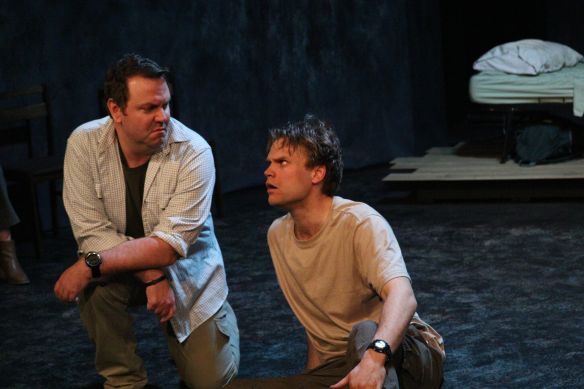 Mum, Me and the IED is a strong, astute work that has been carefully crafted through its entire journey from the thought bubble of Roger Vickery through to performance. Story goes Kevin Jackson was drawn to the writing due to its approach of subject matter. He clearly has an affinity and uses this to direct the play confidently toward its strengths. Characters sit along side the stage, baring witness or turning away according to ideology, and a couple of cast double up’s imply clever mental cross overs that provide valuable insight into Rob’s frame of mind. Martin Kinnane’s lighting draws the audience into the experience of a sufferer of PTSD, particularly posited against Ben Pierpoitn’s sounds which are horribly real. Rachel Scane’s costumes are understated yet beautifully wielded, and her set design is an internal war-horror nightmare that absorbs the audience through the story’s trajectory.