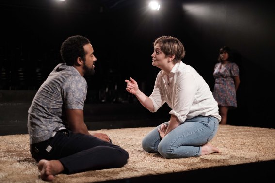 Jessica Arthur is keenly aware the playwright’s words need to tumble with a lightly held intention and she draws this from her very beautiful cast with skill. Eliza Scott and Damon Manns are a self-destructive Romeo and Juliet underplaying their singular drama. Phoebe Grainer is an exquisite observer, part god, part the embodiment of memory circling and tangling the lovers in their own history. The three knit together delicately, moving around the stage and through time. A properly delicate set from Maya Keys forms the sense of and absence of the objects against which the characters project. Equally understated yet present lighting by Martin Kinnane and sound by Jess Dunn form the cohesive whole that becomes Two Hearts. Two Hearts is another thought-provoking night of theatre at KXT.