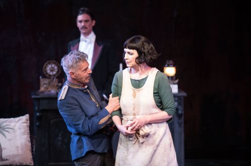 Edgar (Colin Friels) falls easily under the descriptor (anti) Byronic hero as analysed by Kierkegaard in part two of ‘Either/Or’ (1843) under the title “The Aesthetic Validity of Marriage” where Byron’s famous quote “Love is heaven and Marriage is hell” is reviewed. August Strindberg writes his Byronic Edgar as a man of immediacy who needs an instant connection with ‘the other’ and has only the illusory appearance of anything eternal. It is in the reflection of his wife (and at times Kurt) that he ‘exists’ being bound up with her in desiring craving, enjoying etc. He has a sense of himself and his state of despair. He seeks the event that will strike the blow that forces self-reflection; his own death. Colin Friels (dressed up as Strindberg himself) offers us an Edgar who is perpetually playing dead. Yet, as the title reminds us, and Judy Davis would have us see, movement and repetition are as important for August Strindberg as despair. She has this dead couple in perpetual, even comedic motion. It’s an important absurdity Judy Davis intuitively understands. The irony in despair which evolved as a kind of event has now become permanent: ironic ‘repetition’ has been reversed into its own ‘reversed mirror-image.’ As the enormous image of his wife, always looming demands to be torn asunder, equally it requires restitution to save him from a salvation he dreads.