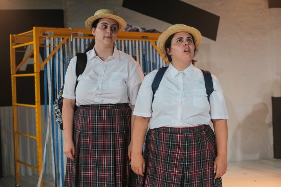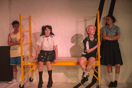 The production starts with standout play Hannah Cockroft’s A Little Death. Natural comedian Toby Blome launches himself onto a piece of Tyler Ray Hawkins iconic scaffolding set with a bang. He has done something unpalatable, unacceptable and irredeemably young. A nervous Bec (Grace Stamnas) is in the same boat. Scant information is fed via subterfuge by Nadine (Kelly Nguyen). A little Death is the embodiment of an early taste of corruption familiar to us all. Another stand out is Sasha Dyer’s Good Boy, Pretty Girl. Emma Wright and Grace Stamnas give the elegantly crafted characters dark comedic twists as girls play out roles afforded them and inflicted by the sins of their parents. New sisters find a way to make a new family forged against the idea of blind obedience. Another excellent play displaying children living out the shadow self of a parent is Emma Skalicky’s Panopticon. Ellie (Emma Wright) and Rosie (Salem Barrett-Brown) must see their mothers as separate from themselves and make choices about the difference between parental guidance and parental influence. Fine writing makes for fine performances here.
