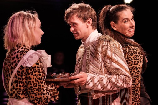 However, it’s really the performances in Leopardskin that strike at the heart of this exciting new Australian work. Guy O’Grady creates the linchpin upon which the show’s antics are held together and in this he shows great skill as the mercurial Luka Maxwell. His sidekick Zoe Jensen as Val Desmond puts in a clever performance that handles its multiple twists and turns with finesse. Ella Watson-Russell is a genuine commanding powerhouse as Olive Darling. The aforementioned Travis Jeffry as Dick Tims and Giuseppe Monterverdi is a delight to witness. Emma Kew is particularly strong, fully transforming to play a variety of characters as is Nick Gell who brings the house down more than once. Comic timing from the team is flawless, and essential, because many of the jokes could fly by if it wasn’t for the careful delivery and well managed patience of the cast. Everyone appears to be having a wonderful time with the production, without losing professionalism or the seriousness commitment to a great show necessitates.