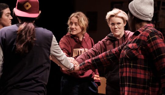 Examining this very issue, MJ Kaufman produces Sensitive Guys. This piece of writing is a nothing short of brilliant diagnosis, in the explosive microcosm of the university, of the complexities arising from the process of untangling misogyny, patriarchy and the everyday horrific violence perpetrated upon women. Embedded in the play itself are the problems associated with this work that produce an overwhelming invisibility that render women’s voices mute. MJ Kaufman cleverly makes gender identification fluid, which gives us the opportunity to ‘see’ identifiable narratives upturned at the point of delivery. Immediately obvious is ‘women playing men’ that occurs when the actors identifying as female (in a powerhouse first scene change) change clothing and behavior to become male, and perform male roles. We ‘see’ male behavior differently because it is delivered by someone we ‘know’ to be female. Even more interesting, when the actors change ‘back’ into women, their narrative is enhanced by their previously being ‘men.’ This enormously clever conceit immediately reveals our essential sanctioning of, in this instance, rape culture, as ‘witness.’ By successfully transforming the gender identification of the actors, MJ Kaufman teaches us about ourselves.