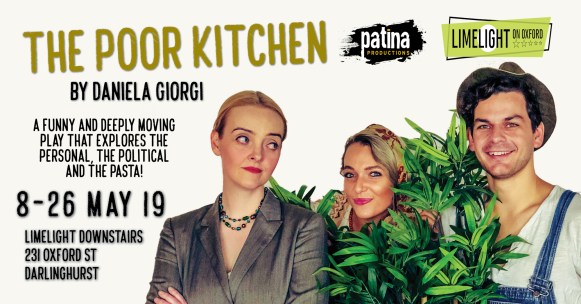 DG: I’m very excited that Patina Productions are producing The Poor Kitchen in their lovely new space, Limelight on Oxford. And I’m very grateful to Julie Baz and Dave Jeffrey for liking the play enough when they saw it to want to re-stage it. As a working playwright I’ve also had the wonderful experience of producing some of my own plays but it’s a great pleasure to have someone else do it and to be able to simply enjoy watching the show as an ordinary audience member. They’ve gathered a lovely cast and with Julie’s direction I’m sure it will be a fun and beautifully put together production. I can’t wait to see it on Opening Night!